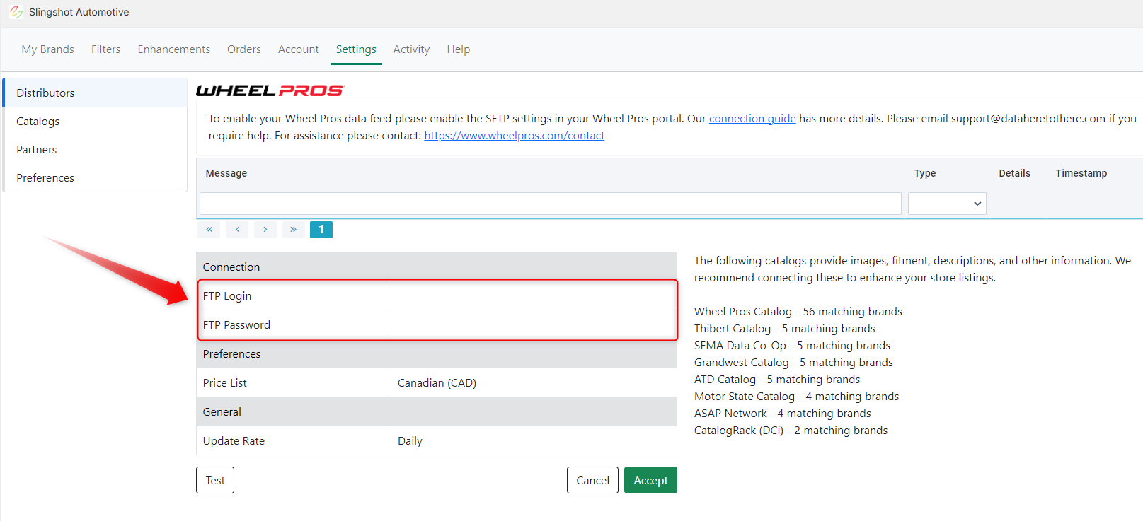 6. Open the "Slingshot automotive" app and navigate to "Settings" then "WheelPros" and enter your SFTP credentials that you set in step 3, then click "Accept"