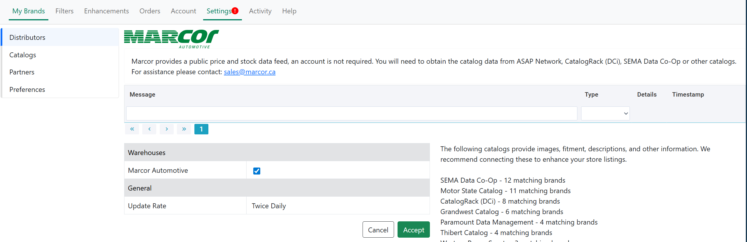 5. Select Marcor Automotive in the warehouses section, and set the update rate to twice daily. Then click accept. You're done!