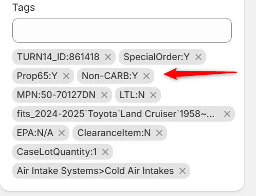 We currently tag products based on if Turn 14 has designated them Non-CARB Compliant or not. CARB only blocks products from shipping to California, and in some cases, New York. No other shipping restrictions are in place currently as far as we know. There's two tags: