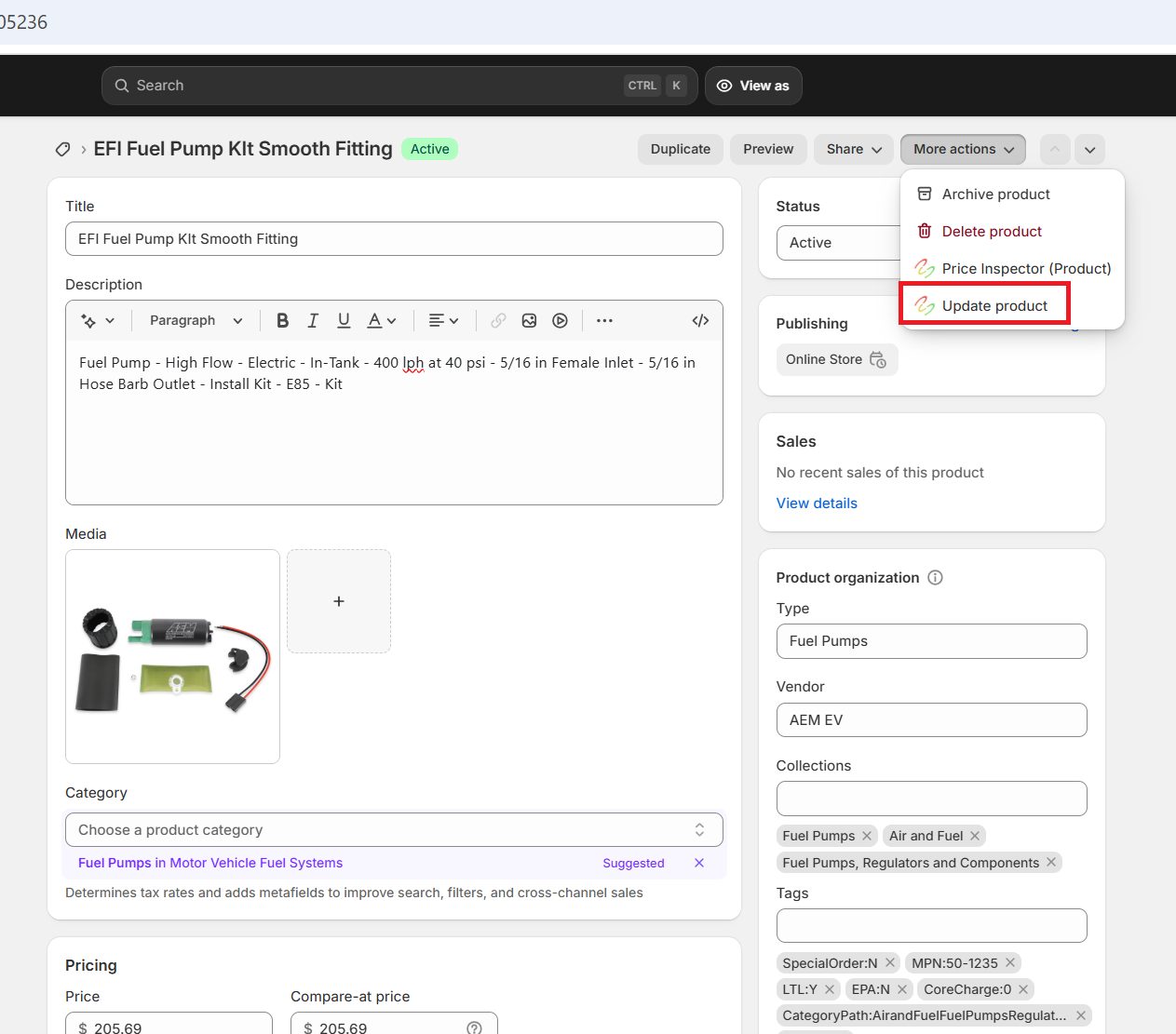 2. Click the more actions menu, and click the Update Product button (see image below).