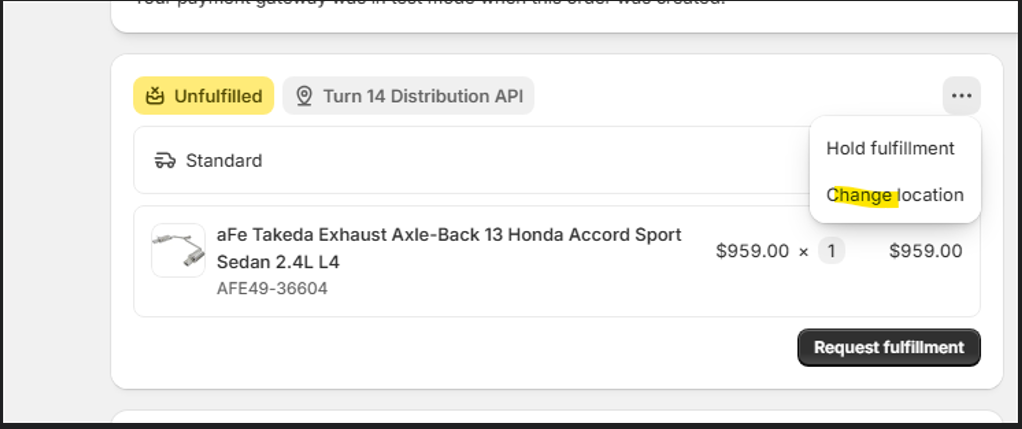 When an order comes in that you need to manage manually, you can simply go into the order, swap the location from the Turn 14 Distribution API to the location you chose to add, for example Turn14 backup. Then you can manually update the order!