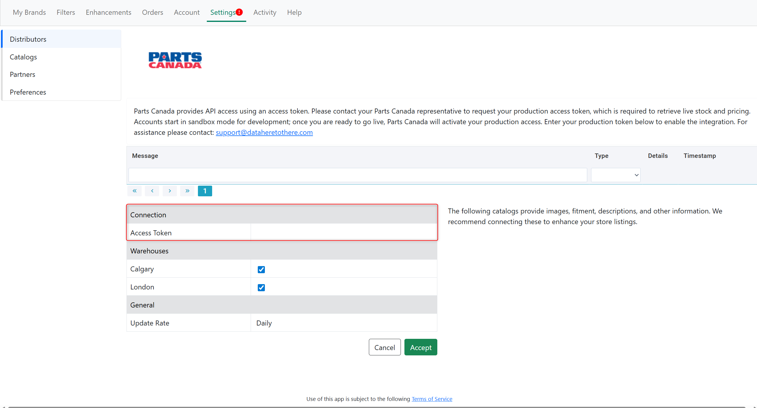 Parts Canada provides API access using an access token. Please contact your Parts Canada representative to request your production access token, which is required to retrieve live stock and pricing. Accounts start in sandbox mode for development; once you are ready to go live, Parts Canada will activate your production access. Enter your production token below to enable the integration.
