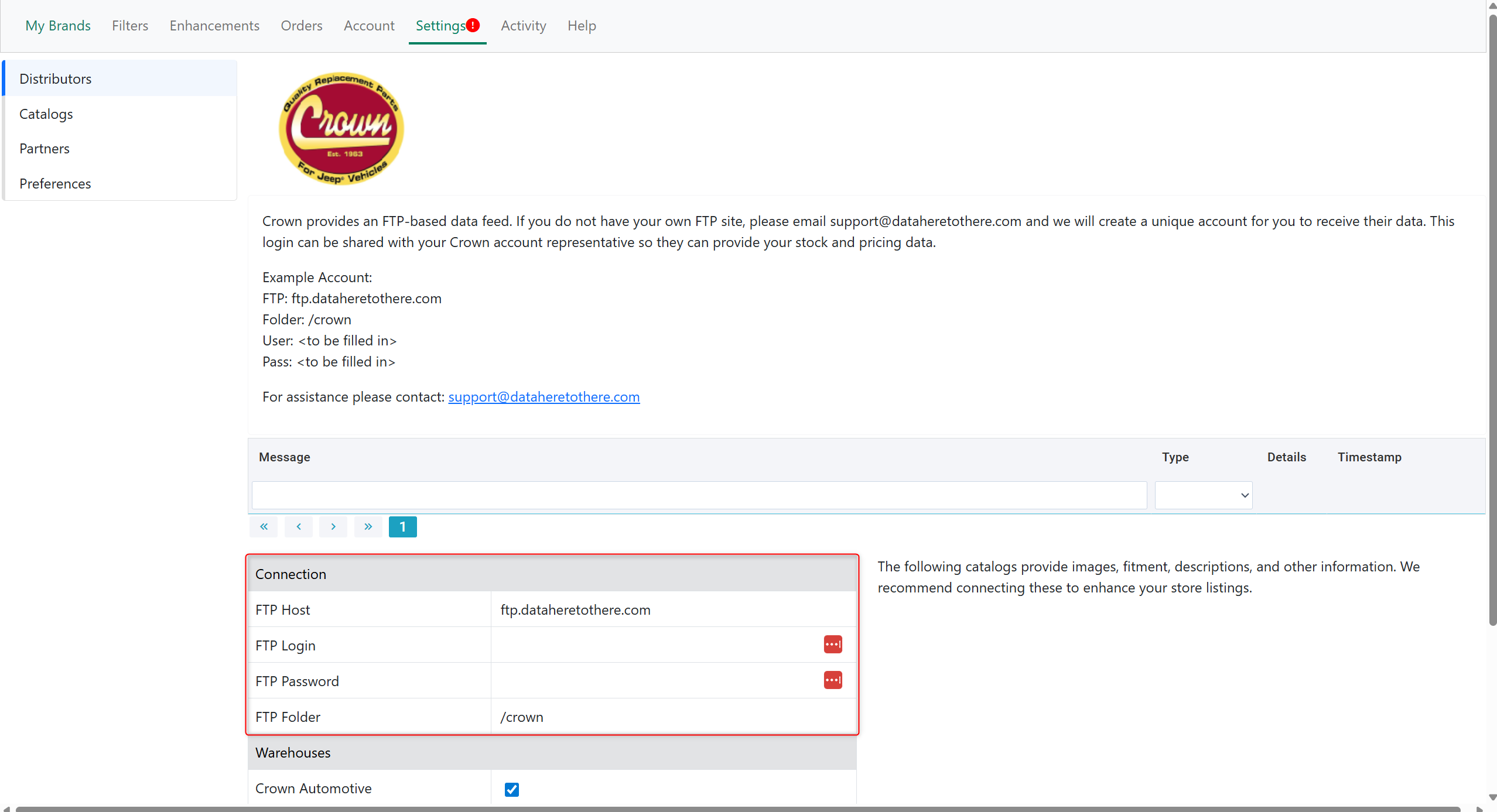 5. Email Support@dataheretothere.com and request an FTP be created for you for Crown. Include the name of your store and URL in this email.