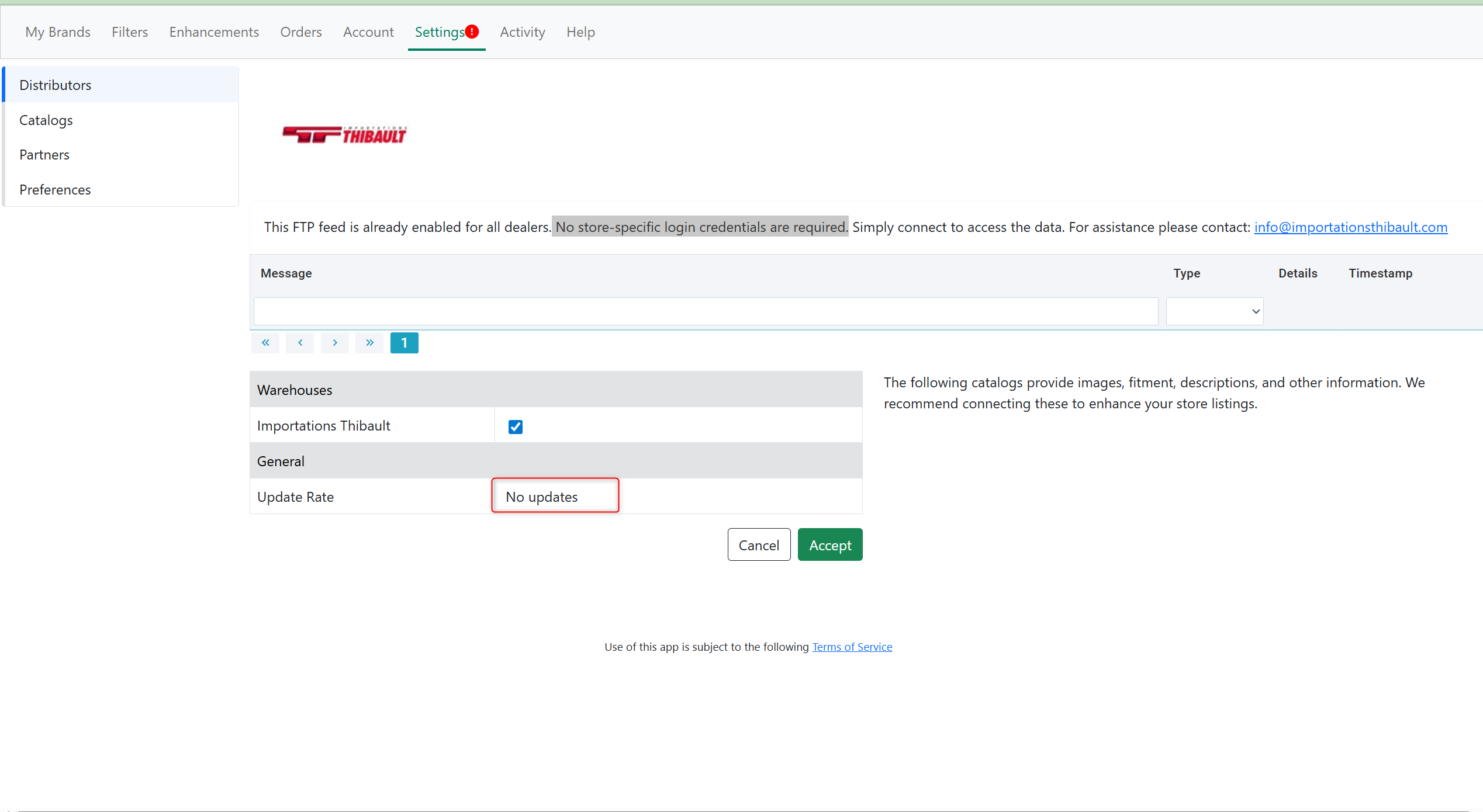For Thibault accounts there's a public feed, so all you need to do in the Slingshot app is hit the connect button! Then just set the update rate to daily and you are done. No store-specific login credentials are required.