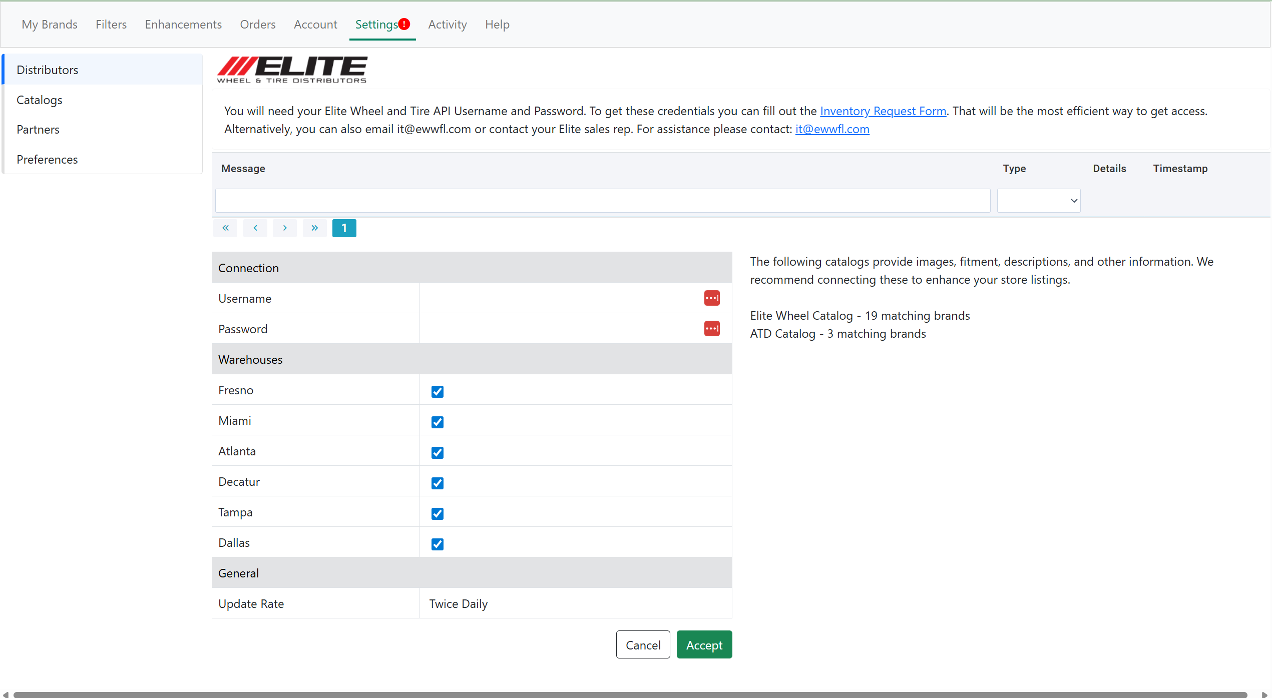 You will need your Elite Wheel and Tire API Username and Password. To get these credentials you can fill out the Inventory Request Form. That will be the most efficient way to get access. Alternatively, you can also email it@ewwfl.com or contact your Elite sales rep.
